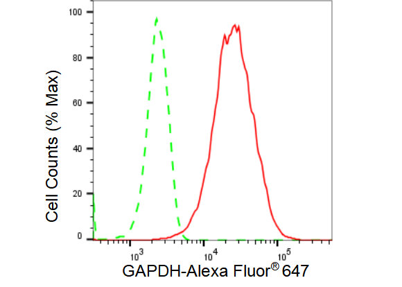 Flow cytometric analysis of GAPDH expression in HepG2 cells using GAPDH antibody. Green, isotype control; red, GAPDH.