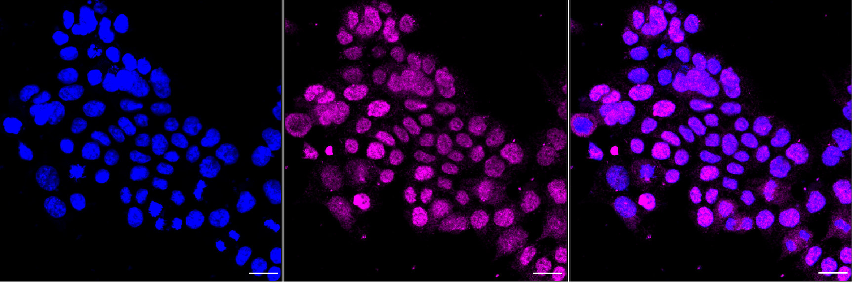 Immunocytochemical staining of HAP1 cells with GATA2/3 antibody. Nuclei were stained blue with DAPI; GATA2/3 was stained magenta with Alexa Fluor? 647. Images were taken using Leica stellaris 5. Protein abundance based on laser Intensity and smart gain: Medium. Scale bar, 20 μm.