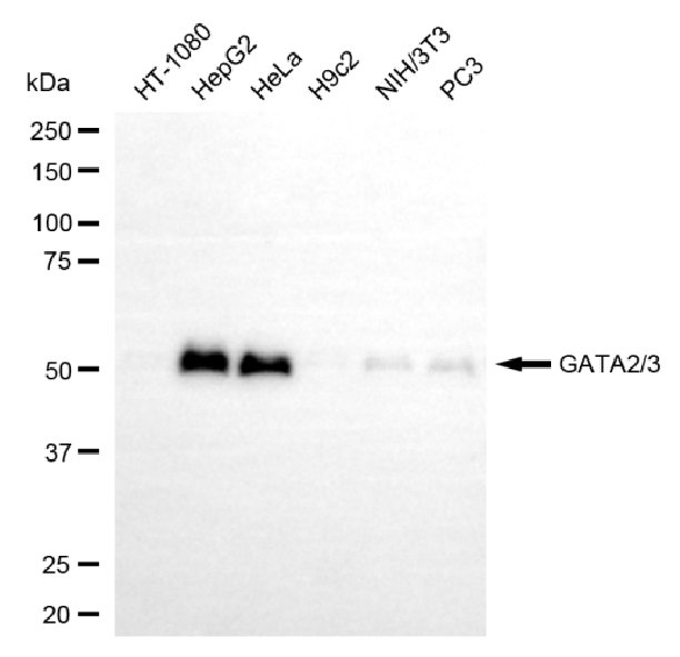 Western blotting analysis using GATA2/3 antibody. Total cell lysates (30 μg) from various cell lines were loaded and separated by SDS-PAGE. The blot was incubated with GATA2/3 antibody and HRP-conjugated goat anti-rabbit secondary antibody respectively.