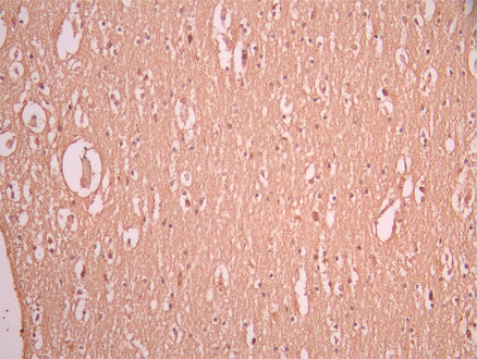 IHC image of CSB-RA916692A0HU diluted at 1:100 and staining in paraffin-embedded human brain tissue performed on a Leica BondTM system. After dewaxing and hydration, antigen retrieval was mediated by high pressure in a citrate buffer (pH 6.0). Section was blocked with 10% normal goat serum 30min at RT. Then primary antibody (1% BSA) was incubated at 4°C overnight. The primary is detected by a Goat anti-rabbit polymer IgG labeled by HRP and visualized using 0.05% DAB.