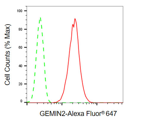 Flow cytometric analysis of GEMIN2 expression in HepG2 cells using GEMIN2 antibody. Green, isotype control; red, GEMIN2.