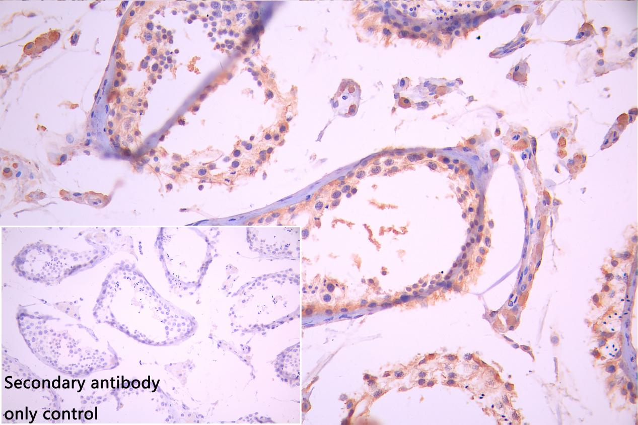 IHC image of CSB-RA009369MA1HU diluted at 1:50 and staining in paraffin-embedded human testis tissue performed on a Leica BondTM system. After dewaxing and hydration, antigen retrieval was mediated by high pressure in a citrate buffer (pH 6.0). Section was blocked with 10% normal goat serum 30min at RT. Then primary antibody (1% BSA) was incubated at 4°C overnight. The primary is detected by a Goat anti-rabbit polymer IgG labeled by HRP and visualized using 0.05% DAB. Secondary antibody only control: uses 1% BSA instead of primary antibody
