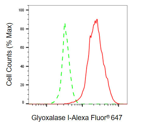 Flow cytometric analysis of glyoxalase I expression in Hela cells using glyoxalase I antibody. Green, isotype control; red, glyoxalase I.