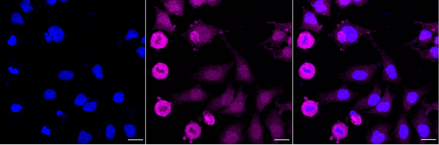 Immunocytochemical staining of Hela cells with glyoxalase I antibody. Nuclei were stained blue with DAPI; Glyoxalase I was stained magenta with Alexa Fluor? 647. Images were taken using Leica stellaris 5. Protein abundance based on laser Intensity and smart gain: Medium. Scale bar, 20 μm.