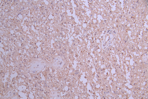 IHC image of CSB-RA210187A0HU diluted at 1:100 and staining in paraffin-embedded human glioma cancer performed on a Leica BondTM system. After dewaxing and hydration, antigen retrieval was mediated by high pressure in a citrate buffer (pH 6.0). Section was blocked with 10% normal goat serum 30min at RT. Then primary antibody (1% BSA) was incubated at 4°C overnight. The primary is detected by a Goat anti-rabbit polymer IgG labeled by HRP and visualized using 0.05% DAB.