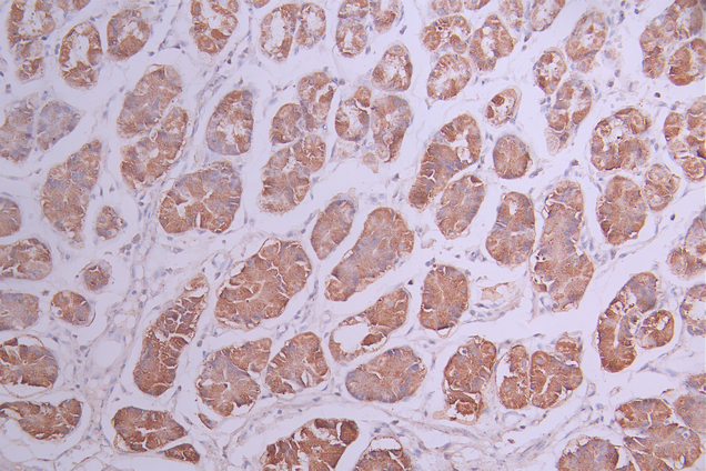 IHC image of CSB-RA210187A0HU diluted at 1:100 and staining in paraffin-embedded human stomach tissue performed on a Leica BondTM system. After dewaxing and hydration, antigen retrieval was mediated by high pressure in a citrate buffer (pH 6.0). Section was blocked with 10% normal goat serum 30min at RT. Then primary antibody (1% BSA) was incubated at 4°C overnight. The primary is detected by a Goat anti-rabbit polymer IgG labeled by HRP and visualized using 0.05% DAB.