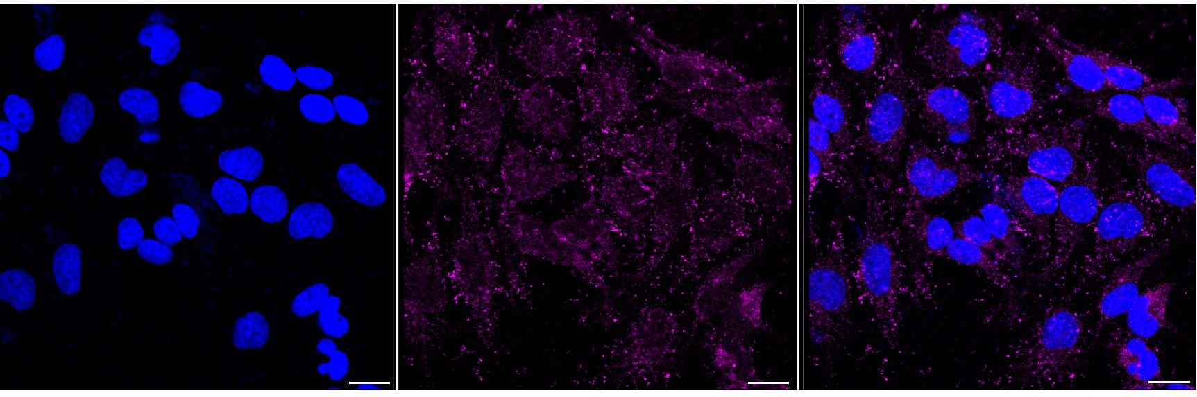 Immunocytochemical staining of Hela cells with GOPC antibody. Nuclei were stained blue with DAPI; GOPC was stained magenta with Alexa Fluor? 647. Images were taken using Leica stellaris 5. Protein abundance based on laser Intensity and smart gain: Medium. Scale bar, 20 μm.