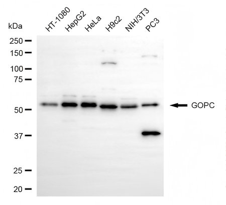 Western blotting analysis using GOPC antibody. Total cell lysates (30 μg) from various cell lines were loaded and separated by SDS-PAGE. The blot was incubated with GOPC antibody and HRP-conjugated goat anti-rabbit secondary antibody respectively.