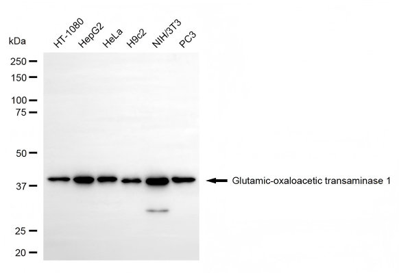 Western blotting analysis using glutamic-oxaloacetic transaminase 1 antibody. Total cell lysates (30 μg) from various cell lines were loaded and separated by SDS-PAGE. The blot was incubated with glutamic-oxaloacetic transaminase 1 antibody and HRP-conjugated goat anti-rabbit secondary antibody respectively.