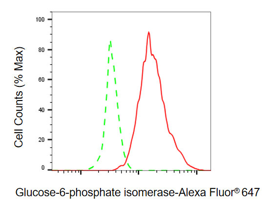 Flow cytometric analysis of glucose-6-phosphate isomerase expression in Hela cells using glucose-6-phosphate isomerase antibody. Green, isotype control; red, glucose-6-phosphate isomerase.