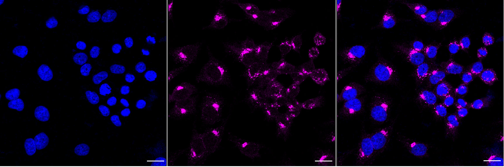 Immunocytochemical staining of Hela cells with glucose-6-phosphate isomerase antibody. Nuclei were stained blue with DAPI; Glucose-6-phosphate isomerase was stained magenta with Alexa Fluor? 647. Images were taken using Leica stellaris 5. Protein abundance based on laser Intensity and smart gain: Medium. Scale bar, 20 μm.