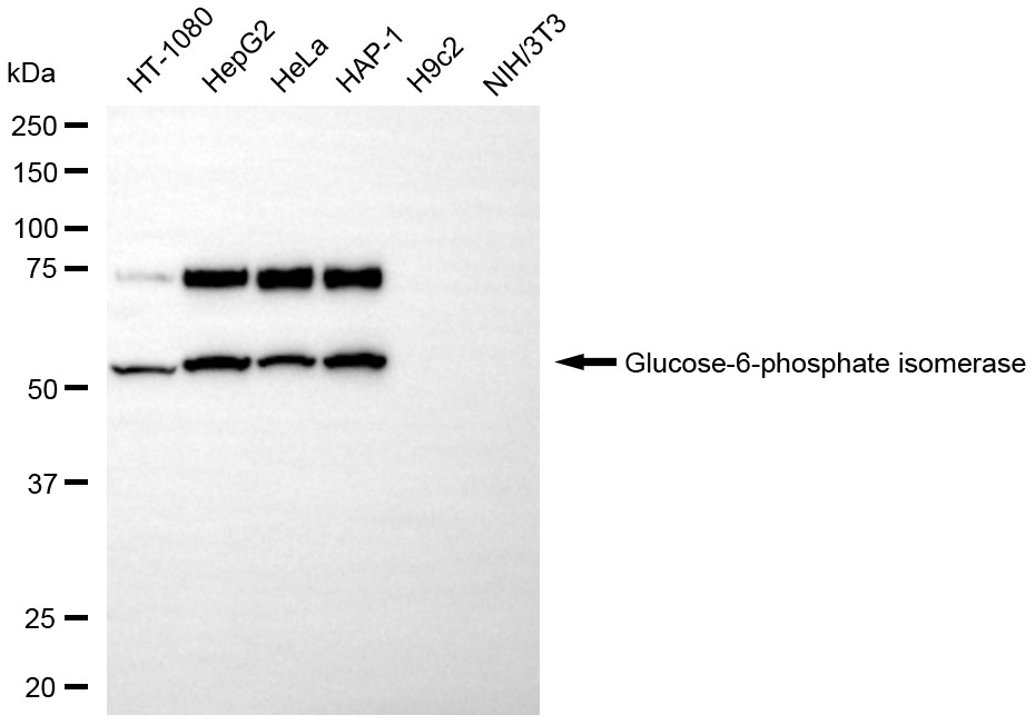 Western blotting analysis using glucose-6-phosphate isomerase antibody. Total cell lysates (30 μg) from various cell lines were loaded and separated by SDS-PAGE. The blot was incubated with glucose-6-phosphate isomerase antibody and HRP-conjugated goat anti-rabbit secondary antibody respectively.