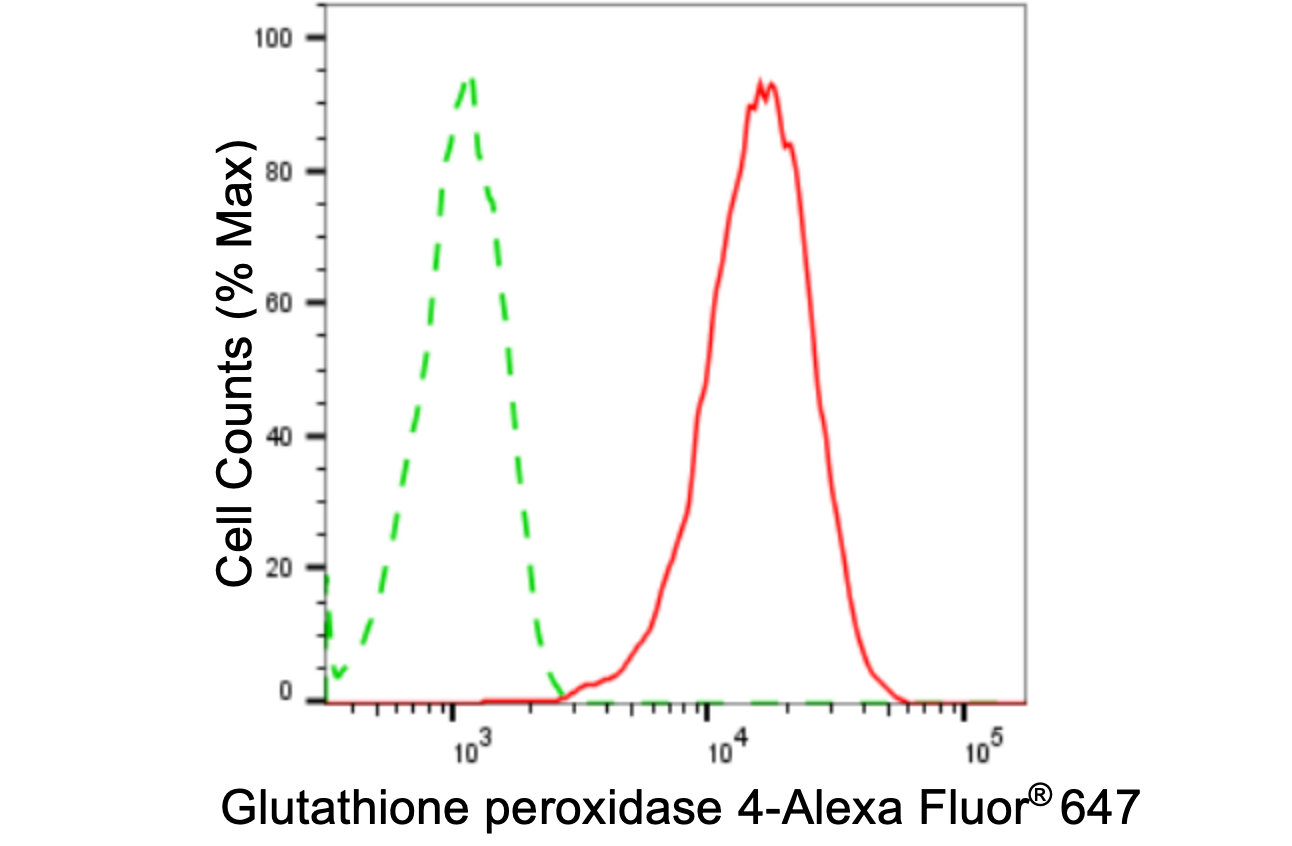 Flow cytometric analysis of glutathione peroxidase 4 expression in HAP-1 cells using glutathione peroxidase 4 antibody. Green, isotype control; red, glutathione peroxidase 4.
