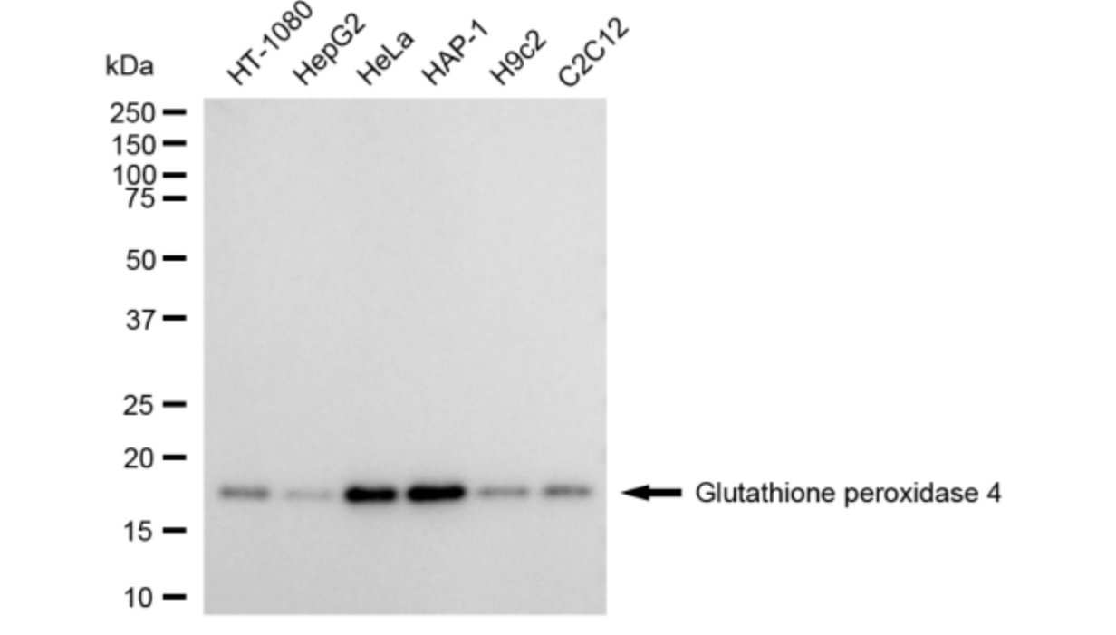 Western blotting analysis using Glutathione peroxidase 4 antibody. Total cell lysates (10 μg) from various cell lines were loaded and separated by SDS-PAGE. The blot was incubated with Glutathione peroxidase 4 antibody and HRP-conjugated goat anti-rabbit secondary antibody respectively.