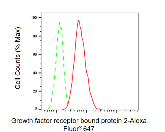 Flow cytometric analysis of Growth factor receptor bound protein 2 expression in HT-1080 cells using Growth factor receptor bound protein 2 antibody. Green, isotype control; red, Growth factor receptor bound protein 2.