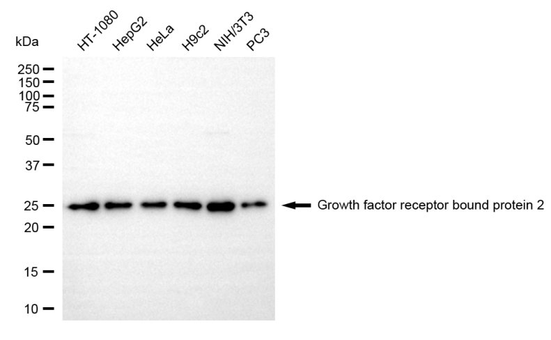 Western blotting analysis using growth factor receptor bound protein 2 antibody. Total cell lysates (30 μg) from various cell lines were loaded and separated by SDS-PAGE. The blot was incubated with growth factor receptor bound protein 2 antibody and HRP-conjugated goat anti-rabbit secondary antibody respectively.