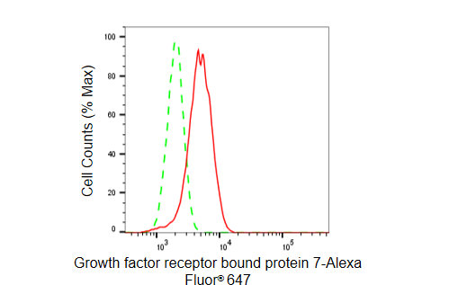 Flow cytometric analysis of Growth factor receptor bound protein 7 expression in HepG2 cells using Growth factor receptor bound protein 7 antibody. Green, isotype control; red, Growth factor receptor bound protein 7.