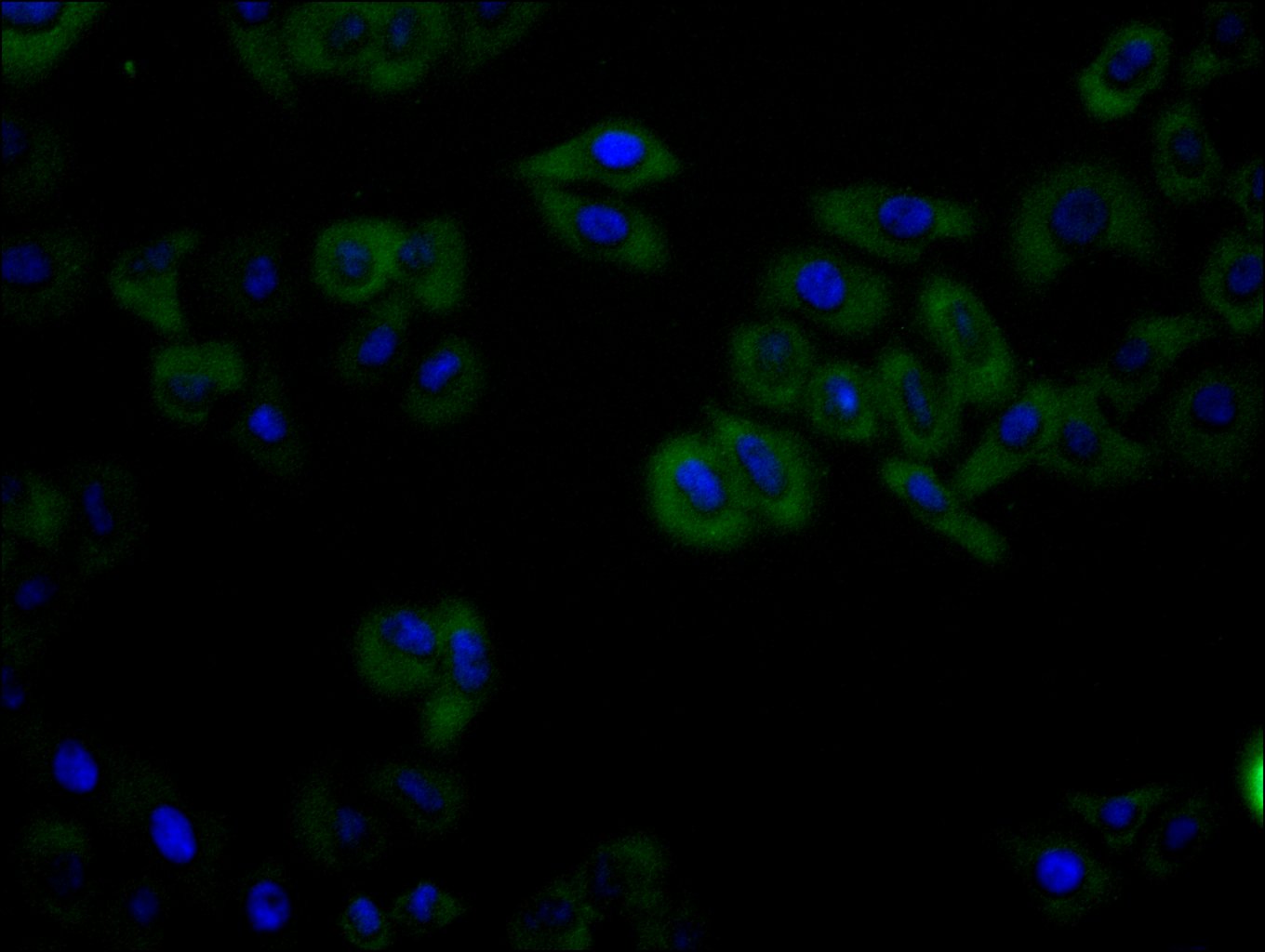 Immunofluorescence staining of Hela cell with CSB-RA079244A0HU at 1:50, counter-stained with DAPI. The cells were fixed in 4% formaldehyde, permeabilized using 0.2% Triton X-100 and blocked in 10% normal Goat Serum. The cells were then incubated with the antibody overnight at 4°C. The secondary antibody was Alexa Fluor 488-congugated AffiniPure Goat Anti-Rabbit IgG(H+L).