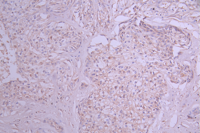 IHC image of CSB-RA079244A0HU diluted at 1:100 and staining in paraffin-embedded human pancreatic cancer performed on a Leica BondTM system. After dewaxing and hydration, antigen retrieval was mediated by high pressure in a citrate buffer (pH 6.0). Section was blocked with 10% normal goat serum 30min at RT. Then primary antibody (1% BSA) was incubated at 4°C overnight. The primary is detected by a Goat anti-rabbit polymer IgG labeled by HRP and visualized using 0.05% DAB.