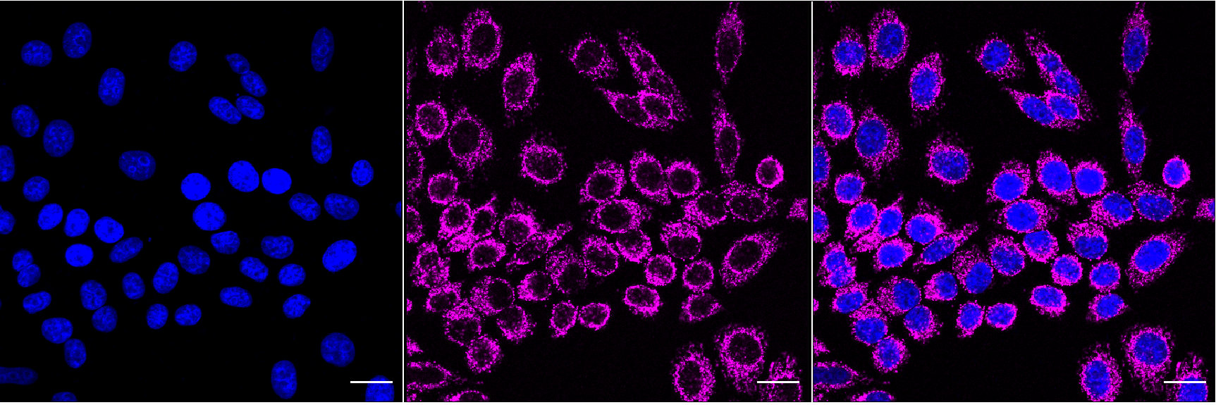 Immunocytochemical staining of HepG2 cells with G-rich RNA sequence binding factor 1 antibody. Nuclei were stained blue with DAPI; G-rich RNA sequence binding factor 1 was stained magenta with Alexa Fluor? 647. Images were taken using Leica stellaris 5. Protein abundance based on laser Intensity and smart gain: Medium. Scale bar, 20 μm.