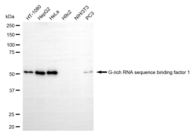 Western blotting analysis using G-rich RNA sequence binding factor 1 antibody. Total cell lysates (30 μg) from various cell lines were loaded and separated by SDS-PAGE. The blot was incubated with G-rich RNA sequence binding factor 1 antibody and HRP-conjugated goat anti-rabbit secondary antibody respectively.