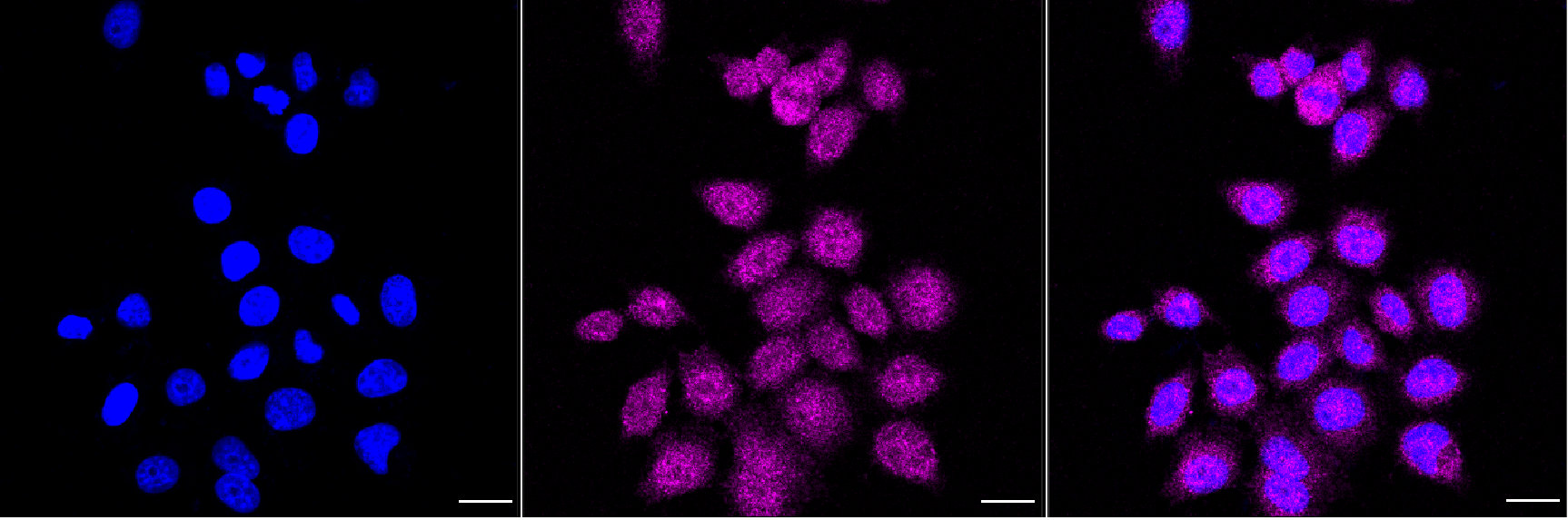 Immunocytochemical staining of HepG2 cells with Goosecoid homeobox antibody. Nuclei were stained blue with DAPI; Goosecoid homeobox was stained magenta with Alexa Fluor? 647. Images were taken using Leica stellaris 5. Protein abundance based on laser Intensity and smart gain: Medium. Scale bar, 20 μm.