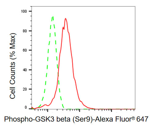 Flow cytometric analysis of phospho-GSK3 beta (Ser9) expression in HepG2 cells using phospho-GSK3 beta (Ser9) antibody. Green, isotype control; red, phospho-GSK3 beta (Ser9).