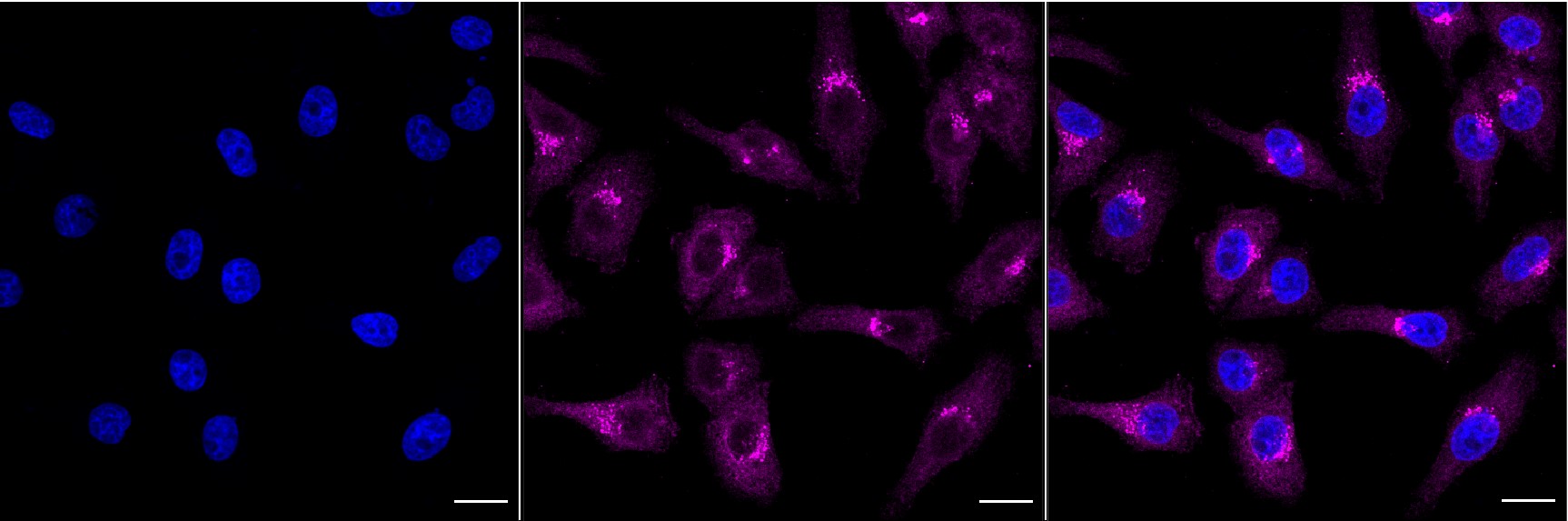 Immunocytochemical staining of HepG2 cells with Phospho-GSK3 beta (Ser9) antibody. Nuclei were stained blue with DAPI; Phospho-GSK3 beta (Ser9) was stained magenta with Alexa Fluor? 647. Images were taken using Leica stellaris 5. Protein abundance based on laser Intensity and smart gain: High. Scale bar, 20 μm.