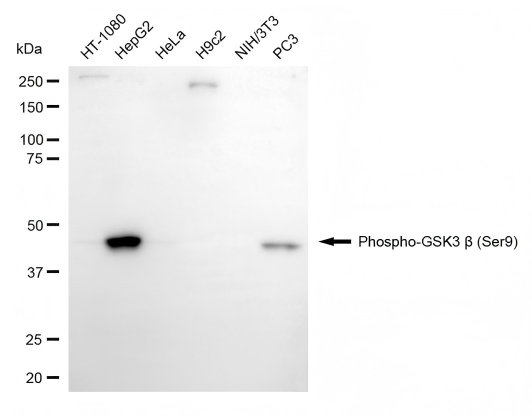 Western blotting analysis using phospho-GSK3 beta (Ser9) antibody. Total cell lysates (30 μg) from various cell lines were loaded and separated by SDS-PAGE. The blot was incubated with phospho-GSK3 beta (Ser9) antibody and HRP-conjugated goat anti-rabbit secondary antibody respectively.