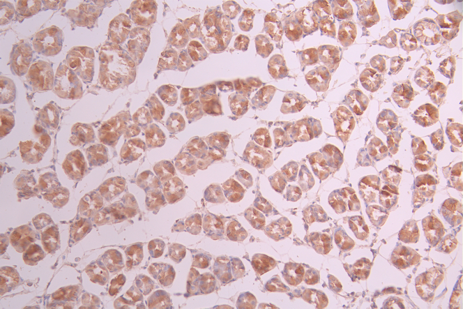IHC image of CSB-RA158046A0HU diluted at 1:100 and staining in paraffin-embedded human stomach tissue performed on a Leica BondTM system. After dewaxing and hydration, antigen retrieval was mediated by high pressure in a citrate buffer (pH 6.0). Section was blocked with 10% normal goat serum 30min at RT. Then primary antibody (1% BSA) was incubated at 4°C overnight. The primary is detected by a Goat anti-rabbit polymer IgG labeled by HRP and visualized using 0.05% DAB.