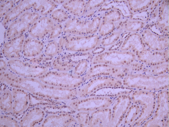 IHC image of CSB-RA237696A0HU diluted at 1:100 and staining in paraffin-embedded human kidney tissue performed on a Leica BondTM system. After dewaxing and hydration, antigen retrieval was mediated by high pressure in a citrate buffer (pH 6.0). Section was blocked with 10% normal goat serum 30min at RT. Then primary antibody (1% BSA) was incubated at 4°C overnight. The primary is detected by a Goat anti-rabbit polymer IgG labeled by HRP and visualized using 0.05% DAB.