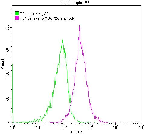 T84 cells were stained with Mouse IgG2a (green line) and anti-GUCY2C antibody (red line) (2μg/1*106cells), washed and then followed by FITC-conjugated Goat Anti-Mouse IgG(H+L) antibody and analyzed with flow cytometry.