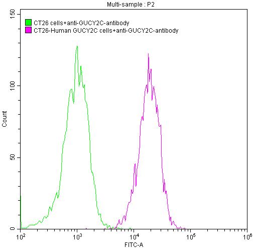 Untransfected CT26 cells surface (green line) and transfected Human GUCY2C CT26 stable cells surface (red line) were stained with anti-GUCY2C antibody (2μg/1*106cells), washed and then followed by FITC-conjugated Goat Anti-Mouse IgG(H+L) antibody and analyzed with flow cytometry.