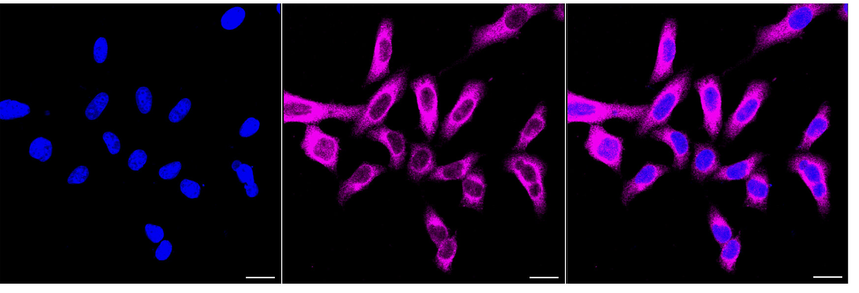 Immunocytochemical staining of HepG2 cells with phospho-glycogen synthase 1 (S641) antibody. Nuclei were stained blue with DAPI; Phospho-glycogen synthase 1 (S641) was stained magenta with Alexa Fluor? 647. Images were taken using Leica stellaris 5. Protein abundance based on laser Intensity and smart gain: Medium. Scale bar, 20 μm.