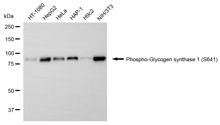 Western blotting analysis using phospho-glycogen synthase 1 (S641) antibody. Total cell lysates (30 μg) from various cell lines were loaded and separated by SDS-PAGE. The blot was incubated with phospho-glycogen synthase 1 (S641) antibody and HRP-conjugated goat anti-rabbit secondary antibody respectively.