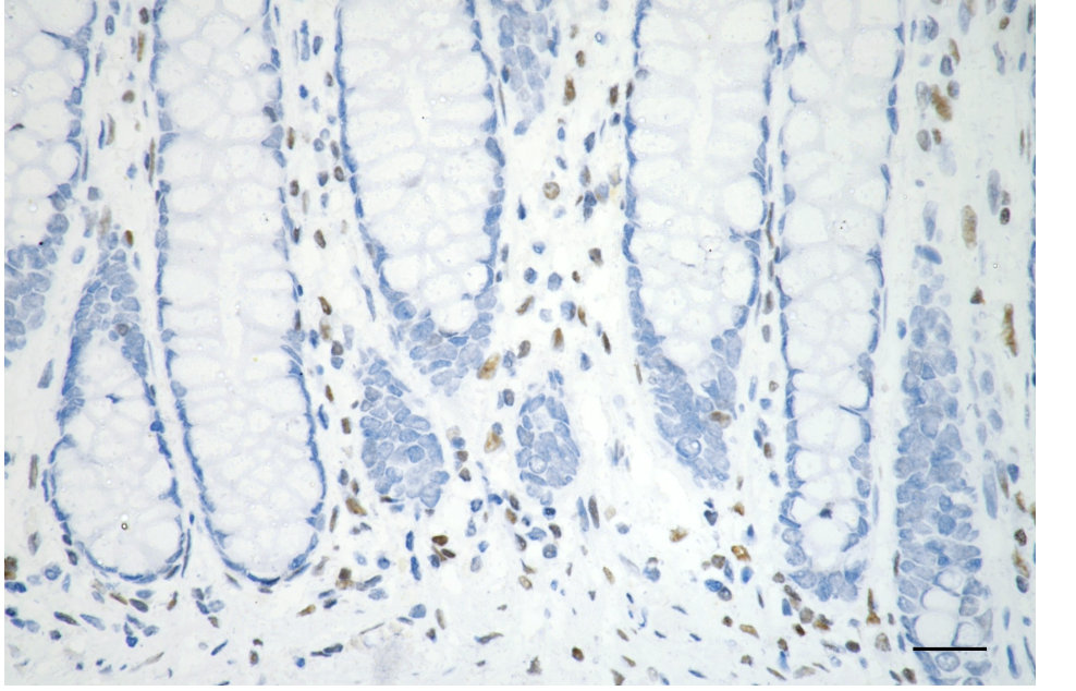 Immunohistochemistry was performed on paraffin-embedded human sigmoid colon carcinoma using phospho-histone H3.3 (S31) antibody. Antigen retrieval was done in sodium citrate buffer (pH 6.0). DAB was used for detection, with hematoxylin counterstaining. Images were acquired using a Nikon Ci-L Plus microscope (40× objective). Scale bar: 25 μm.