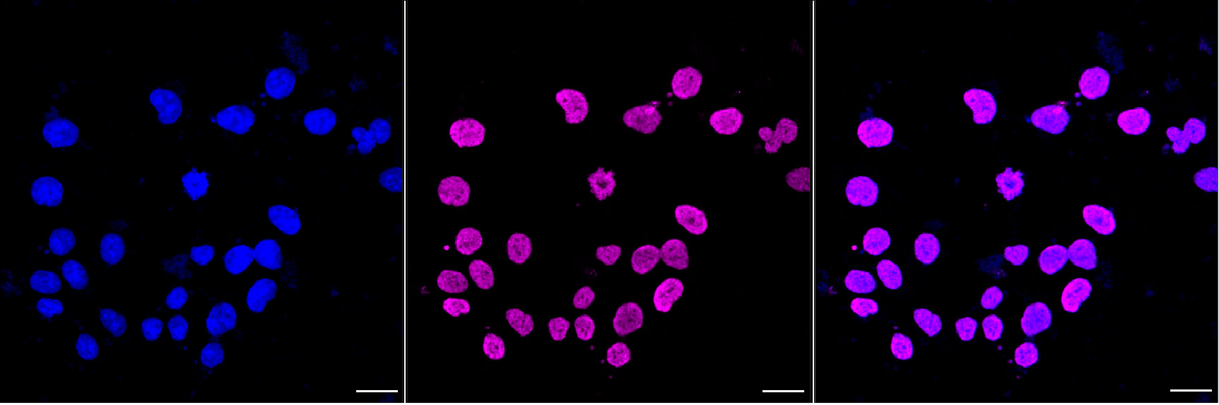 Immunocytochemical staining of HAP-1 cells with Histone H3 (acetyl K18) antibody. Nuclei were stained blue with DAPI; Histone H3 (acetyl K18) was stained magenta with Alexa Fluor? 647. Images were taken using Leica stellaris 5. Protein abundance based on laser Intensity and smart gain: High. Scale bar, 20 μm.