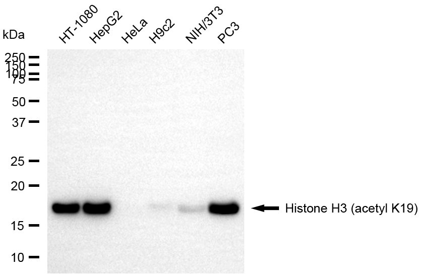 Western blotting analysis using histone H3 (acetyl K19) antibody. Total cell lysates (30 μg) from various cell lines were loaded and separated by SDS-PAGE. The blot was incubated with histone H3 (acetyl K19) antibody and HRP-conjugated goat anti-rabbit secondary antibody respectively.