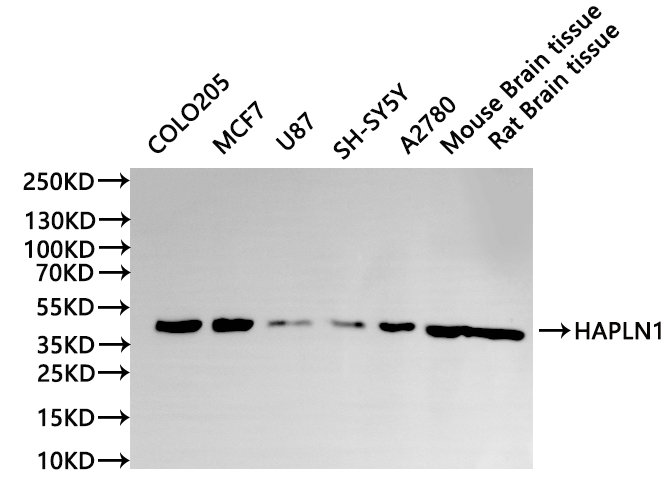 , Positive WB detected in:COLO205 whole cell lysate(30μg), MCF7 whole cell lysate(30μg), U87 whole cell lysate(30μg), SH-SY5Y whole cell lysate(30μg), A2780 whole cell lysate(30μg), Mouse brainr tissue lysate(30μg), Rat brain lysate(30μg)