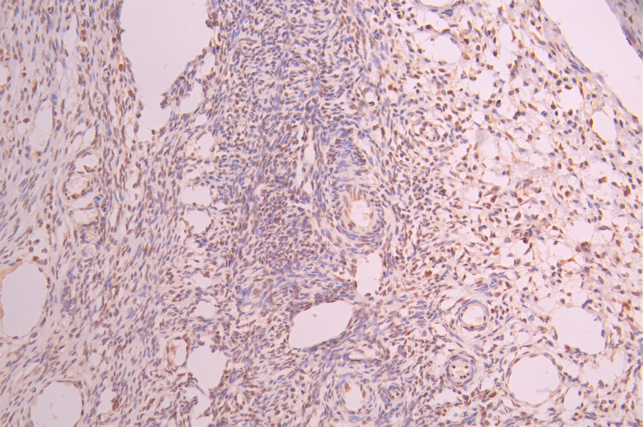IHC image of CSB-RA215311A0HU diluted at 1:100 and staining in paraffin-embedded human ovarian cancer performed on a Leica BondTM system. After dewaxing and hydration, antigen retrieval was mediated by high pressure in a citrate buffer (pH 6.0). Section was blocked with 10% normal goat serum 30min at RT. Then primary antibody (1% BSA) was incubated at 4°C overnight. The primary is detected by a Goat anti-rabbit polymer IgG labeled by HRP and visualized using 0.05% DAB.