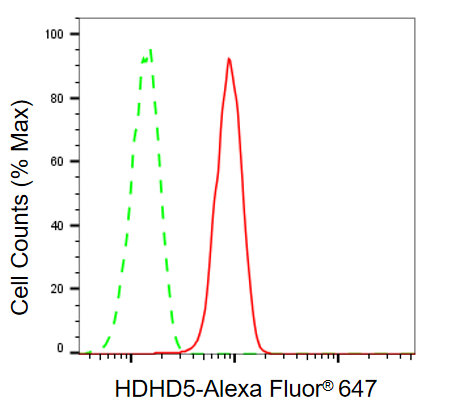 Flow cytometric analysis of HDHD5 expression in HepG2 cells using HDHD5 antibody. Green, isotype control; red, HDHD5.