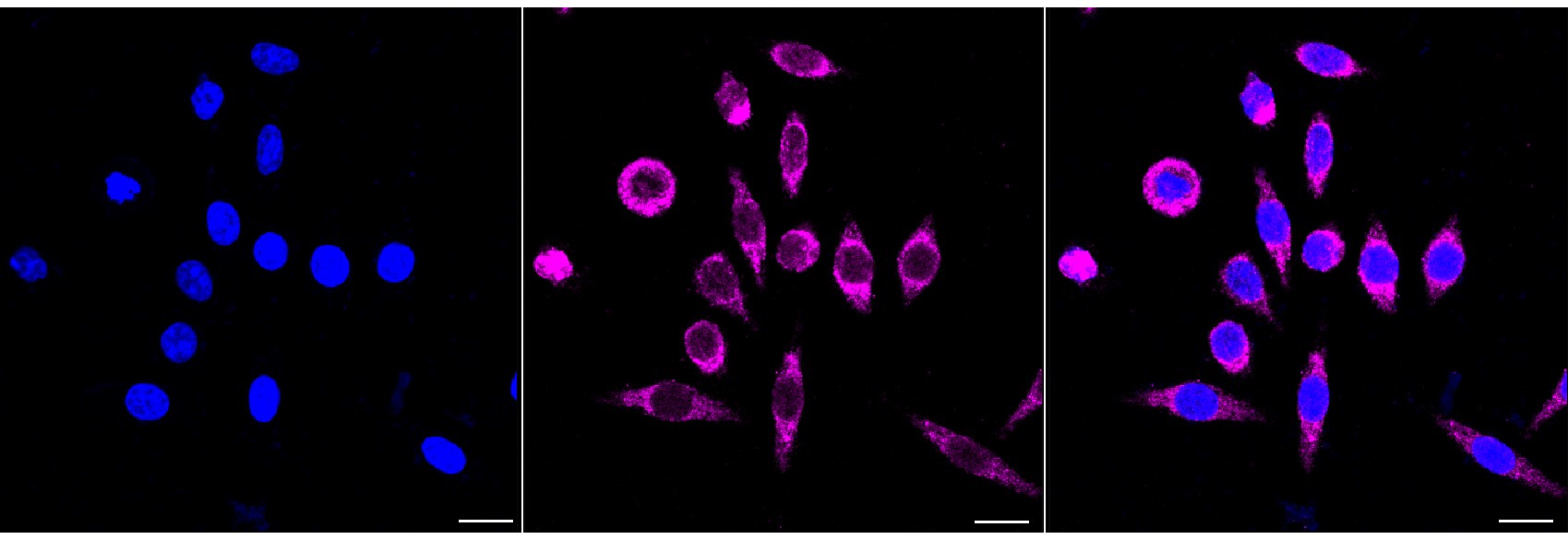 Immunocytochemical staining of HepG2 cells with HDHD5 antibody. Nuclei were stained blue with DAPI; HDHD5 was stained magenta with Alexa Fluor? 647. Images were taken using Leica stellaris 5. Protein abundance based on laser Intensity and smart gain: Medium. Scale bar, 20 μm.
