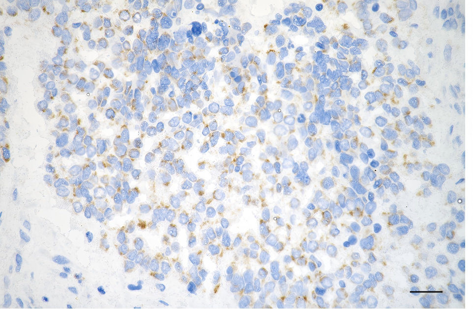 Immunohistochemistry was performed on paraffin-embedded human breast carcinoma using HDHD5 antibody. Antigen retrieval was done in sodium citrate buffer (pH 6.0). DAB was used for detection, with hematoxylin counterstaining. Images were acquired using a Nikon Ci-L Plus microscope (40× objective). Scale bar: 25 μm.