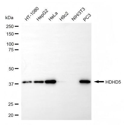 Western blotting analysis using HDHD5 antibody. Total cell lysates (30 μg) from various cell lines were loaded and separated by SDS-PAGE. The blot was incubated with HDHD5 antibody and HRP-conjugated goat anti-rabbit secondary antibody respectively.