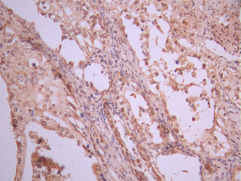 IHC image of CSB-RA299916A0HU diluted at 1:100 and staining in paraffin-embedded human pancreatic cancer performed on a Leica BondTM system. After dewaxing and hydration, antigen retrieval was mediated by high pressure in a citrate buffer (pH 6.0). Section was blocked with 10% normal goat serum 30min at RT. Then primary antibody (1% BSA) was incubated at 4°C overnight. The primary is detected by a Goat anti-rabbit polymer IgG labeled by HRP and visualized using 0.05% DAB.
