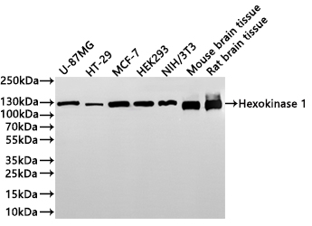 Positive WB detected in: U-87MG whole cell lysate(30μg), HT-29 whole cell lysate(30μg), MCF-7 whole cell lysate(30μg), HEK293 whole cell lysate(30μg), NIH/3T3 whole cell lysate(30μg), Mouse brain tissue lysate(30μg), Rat brain tissue lysate(30μg)