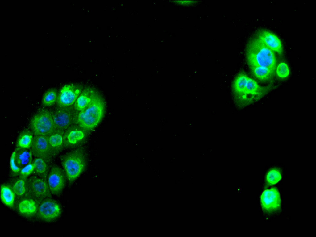 Immunofluorescence staining of A431 cell with CSB-RA599206A0HU at 1:50, counter-stained with DAPI. The cells were fixed in 4% formaldehyde, permeabilized using 0.2% Triton X-100 and blocked in 10% normal Goat Serum. The cells were then incubated with the antibody overnight at 4°C. The secondary antibody was Alexa Fluor 488-congugated AffiniPure Goat Anti-Rabbit IgG(H+L).