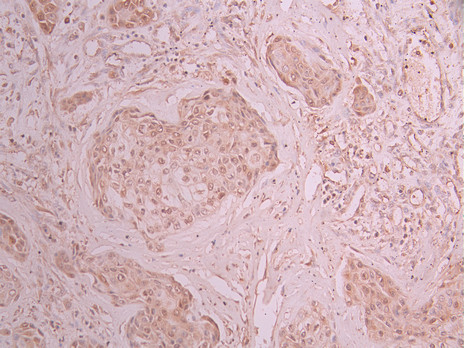 IHC image of CSB-RA599206A0HU diluted at 1:100 and staining in paraffin-embedded human pancreatic cancer performed on a Leica BondTM system. After dewaxing and hydration, antigen retrieval was mediated by high pressure in a citrate buffer (pH 6.0). Section was blocked with 10% normal goat serum 30min at RT. Then primary antibody (1% BSA) was incubated at 4°C overnight. The primary is detected by a Goat anti-rabbit polymer IgG labeled by HRP and visualized using 0.05% DAB.