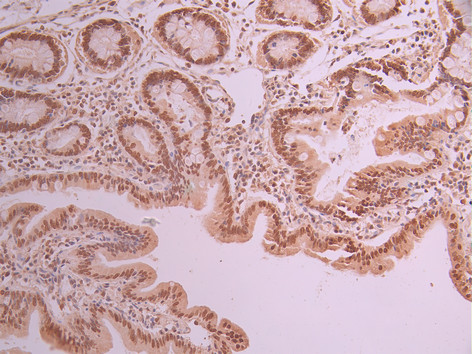 IHC image of CSB-RA599206A0HU diluted at 1:100 and staining in paraffin-embedded human small intestine tissue performed on a Leica BondTM system. After dewaxing and hydration, antigen retrieval was mediated by high pressure in a citrate buffer (pH 6.0). Section was blocked with 10% normal goat serum 30min at RT. Then primary antibody (1% BSA) was incubated at 4°C overnight. The primary is detected by a Goat anti-rabbit polymer IgG labeled by HRP and visualized using 0.05% DAB.