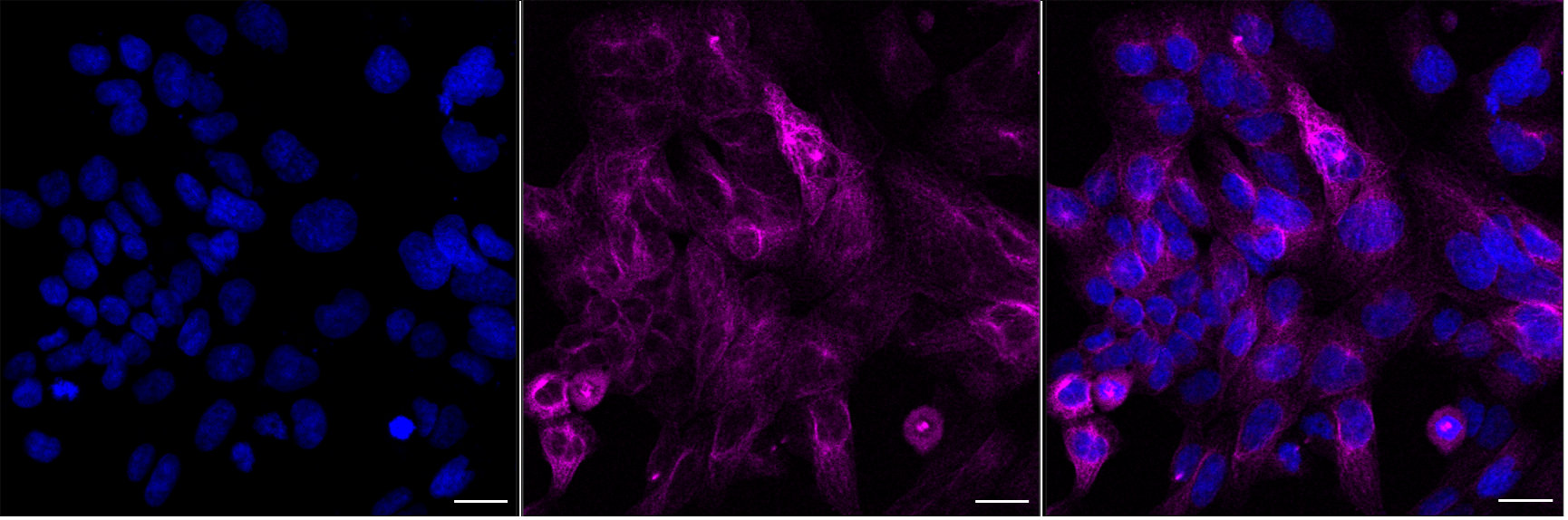 Immunocytochemical staining of HAP-1 cells with CD168 antibody. Nuclei were stained blue with DAPI; CD168 was stained magenta with Alexa Fluor? 647. Images were taken using Leica stellaris 5. Protein abundance based on laser Intensity and smart gain:Low. Scale bar, 20 μm.